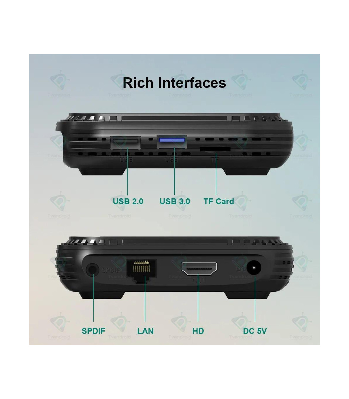 منبع تغذیه: DC 5V/2A نشانگر برق (LED) روشن: آبی HDR: حالت های HDR10 و HLG USB: 1x Type-A USB3.0، 1x Type-A USB2.0 کارت خوان: کارت های TF سیستم فایل HDD: FAT16/FAT32/NTFS پشتیبانی از زیرنویس: SRT/SMI/SUB/SSA/IDX+USB خروجی فیلم HD: 6k LAN: اترنت: 10/100 متر/1000 متر استاندارد RJ-45 بیسیم: وایفای دو باند 2.4 و 5 گیگاهرتز، 802.11 A/B/G/N/AC BT: V4.1 SPDIF/IEC958: نوری ماوس/صفحه کلید: پشتیبانی از ماوس و صفحه کلید از طریق USB. پشتیبانی از ماوس و صفحه کلید بی سیم 2.4 گیگاهرتز از طریق دانگل USB 2.4 گیگاهرتز گواهینامه: CE، FCC، ROHS